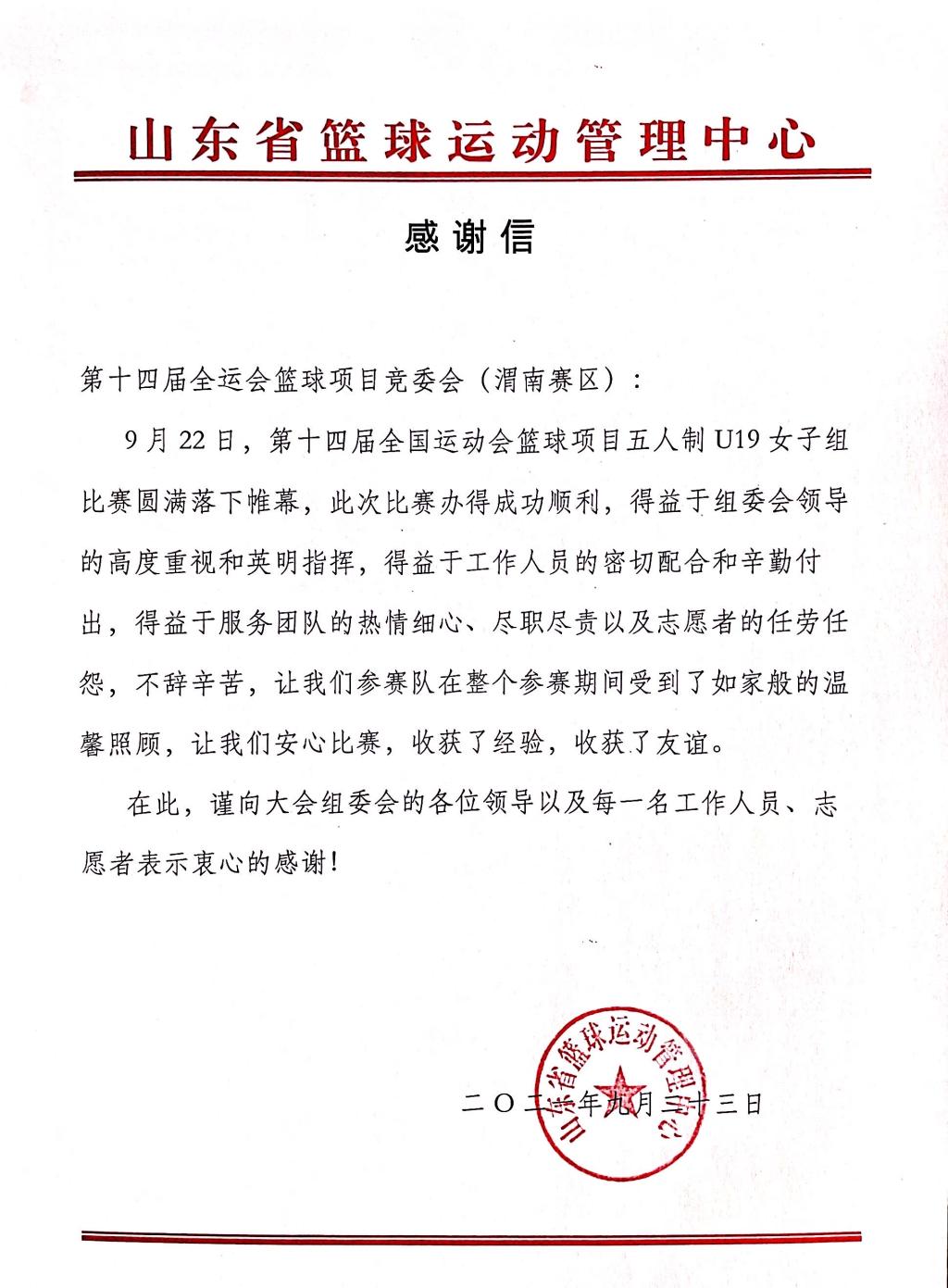 第十四届全国运动会篮球女子五人制U19组比赛得到了中国篮协、省组委会和市执委会的关心、支持和指导,为竞委会提供了全方位的技术指导和运行指挥。同时,医疗、安保、电力、媒体等也给予了赛事大力支持与保障。比赛期间,党委书记卓宇、副书记韩小卫亲临现场表示慰问和感谢。整场赛事在竞委会各职能处室高度重视、合力协作下,赛事举行得全面有序、安全顺利、精彩圆满,受到了项目竞委会、技术官员及社会各界的好评和赞誉。