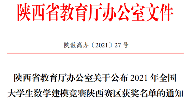 近日,陕西省教育厅办公室发文公布了2021年全国大学生数学建模竞赛陕西赛区获奖名单,我校有44支队伍参加本次竞赛,22支队伍获奖(获奖率50%),其中杨涛涛、官辰雨、冯佳瑜三位同学组成的参赛队喜获全国一等奖,李雨蔓、冯易炫、罗星美同学组成的参赛队荣获全国二等奖。另外,我校有4支参赛队喜获陕西赛区一等奖,16支参赛队伍喜获陕西赛区二等奖,刘炳全荣获陕西赛区优秀指导教师。