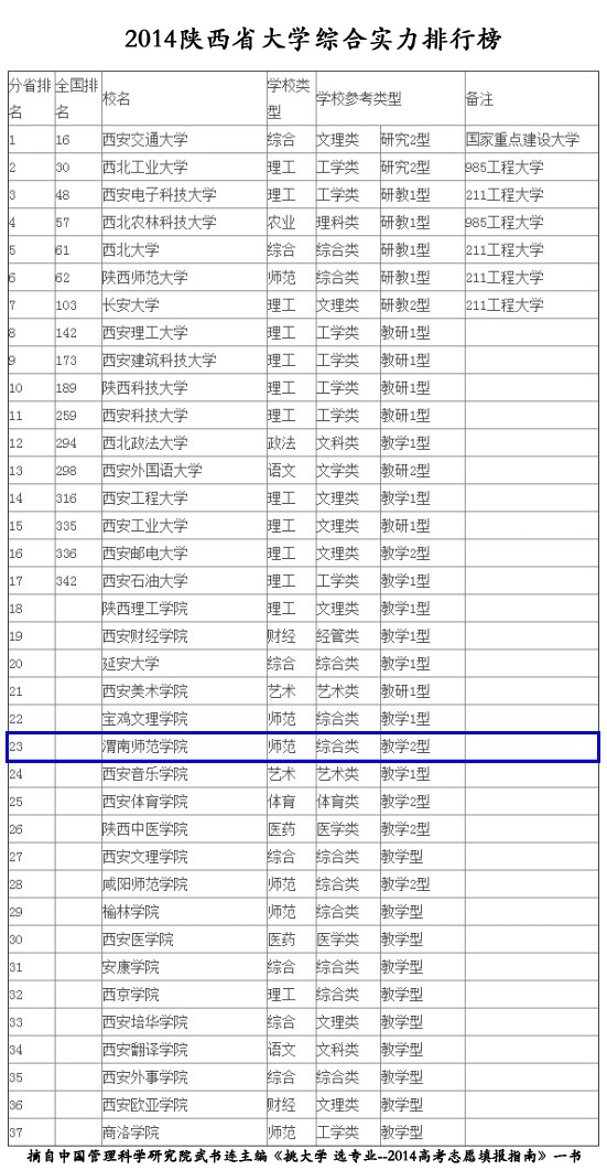 以上数据摘自由中国管理科学研究院武书连主编、中国统计出版社出版的《挑大学选专业--2014高考志愿填报指南》,已于2013年12月出版发行,全书120万字。我校2014年在陕西省37所高校综合实力排行榜中位列第23名,处于全省同类院校前列,比2013年的第25名提前了2名。