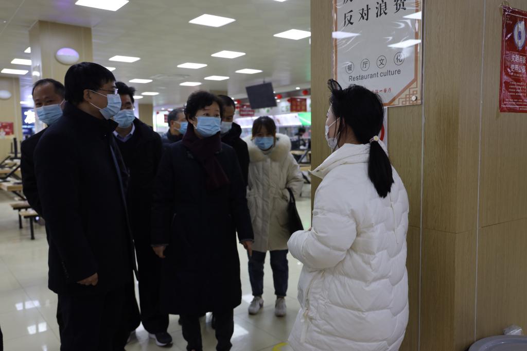 刘莉一行实地走访调研了校内超市、餐饮中心、学生公寓等场所,听取了我校疫情防控工作情况汇报,详细询问了校内师生管理和服务保障、防疫应急物资储备、在线教学开展等情况。