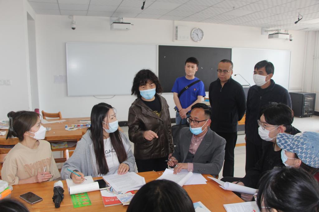 随后,王菊霞一行来到美术学院,听取了美术学院副院长梁卫民对毕业班学生毕业论文的指导意见,在美术学院文化廊道观看了学生创作作品,在实训楼检查了美术学191班《油画全身人物写生》及产品设计191班《装饰艺术》上课情况,并与授课教师张巍译、尹琨、兰星俊进行交流。