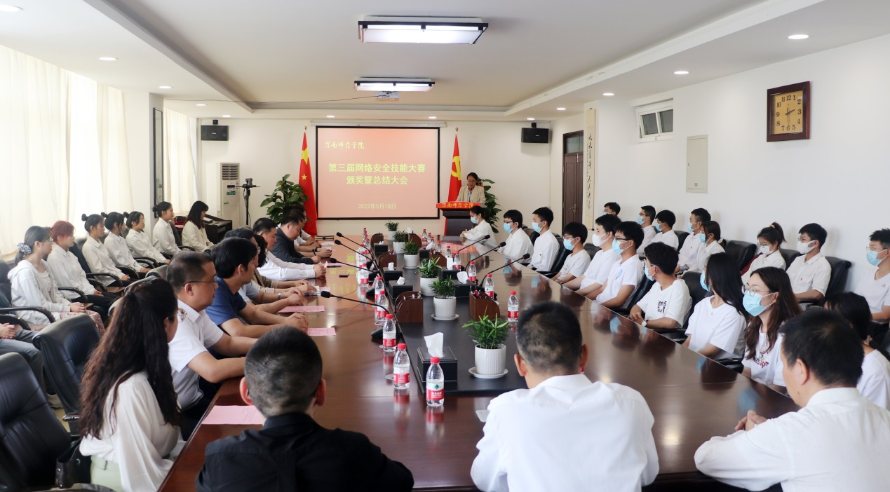 5月18日下午,由学校团委主办、计算机学院承办的欧宝娱乐官方app第三届网络安全技能大赛颁奖暨总结大会在厚德楼第二会议室举行。学校党委书记卓宇、党委副书记汪勇、副校长王菊霞出席大会,团委副书记肖飞、计算机学院党政负责人、各专业建设负责人、获奖学生等参加大会。大会由计算机学院党总支副书记武楠主持。