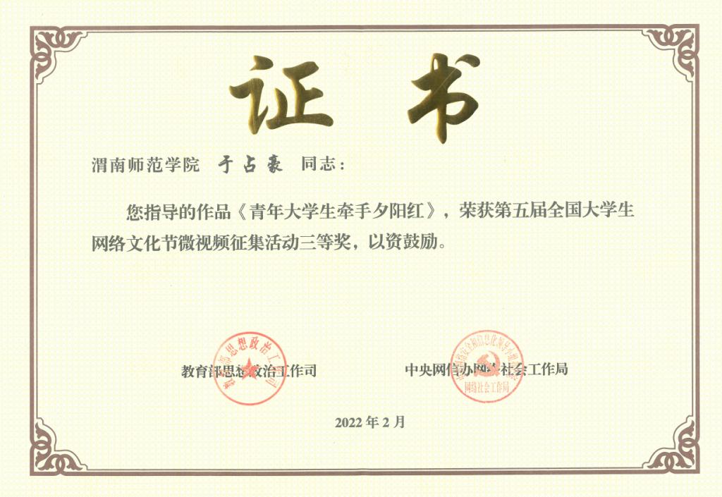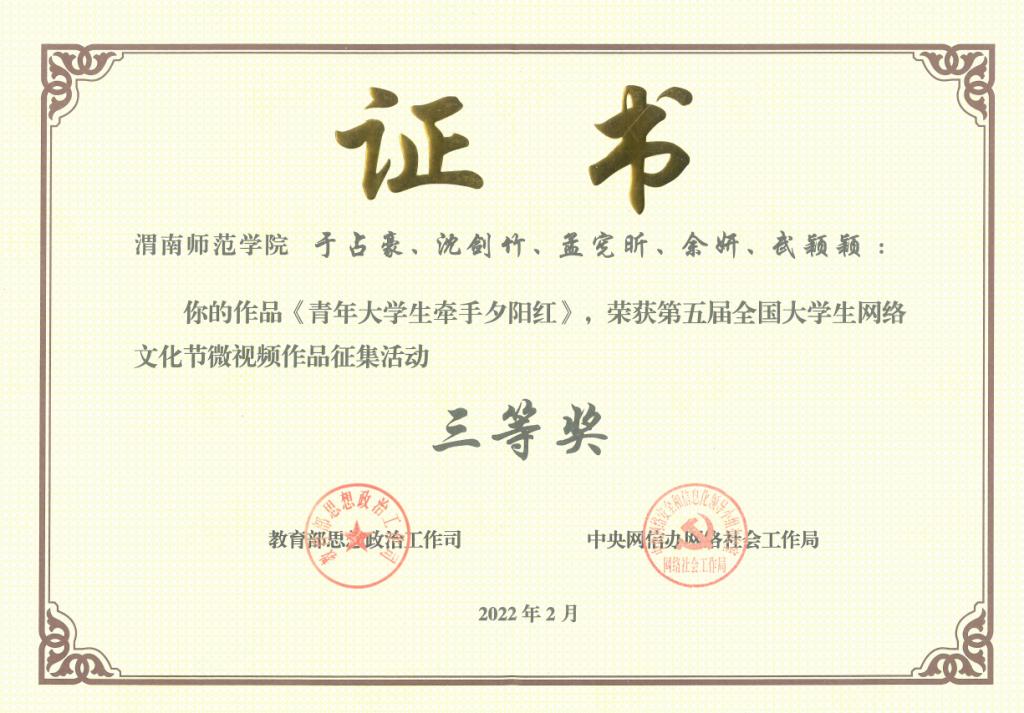 近期,教育部思想政治工作司、中央网信办网络社会工作局公布了《关于公布第五届全国大学生网络文化节和全国高校网络教育优秀作品推选展示活动入选名单的通知》,我校电视台参选的作品《青年大学生牵手夕阳红》荣获微视频类三等奖,《一方水土“扶”一方人》荣获微电影类优秀奖。这是我校首次在全国大学生网络文化节活动中获奖,获奖数量和等次位列全省前五。