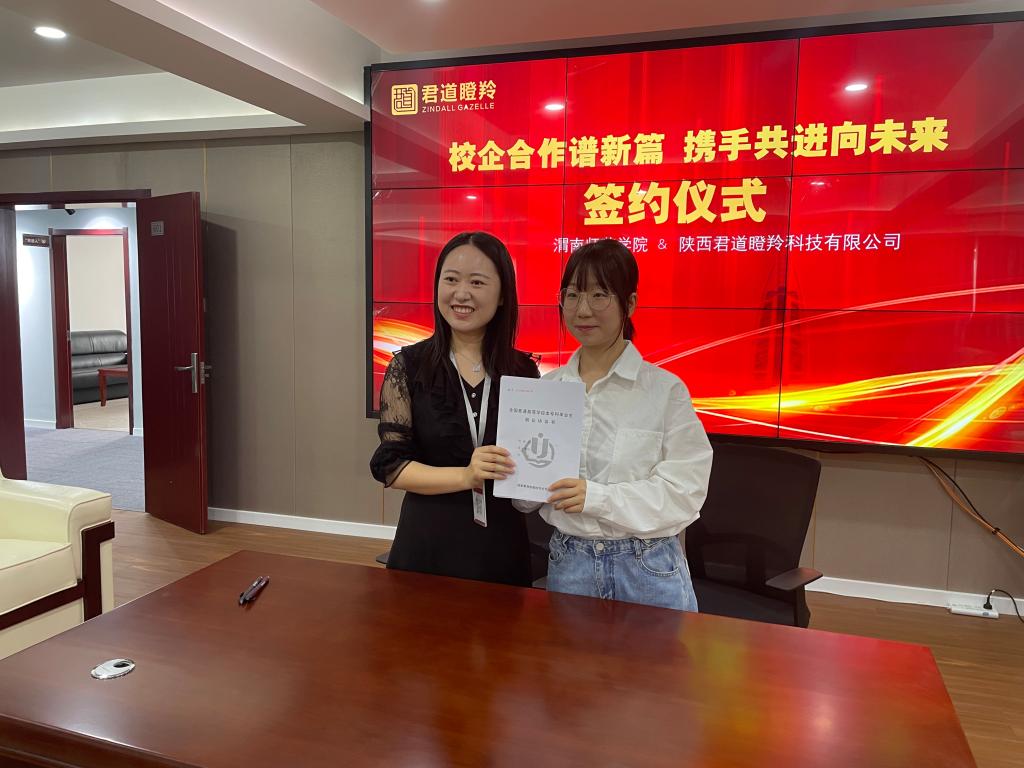 随后,汪勇与王刘华签订了《共建大学生就业基地协议》,并为陕西君道瞪羚科技有限公司授大学生就业基地牌。我校经济与管理学院毕业生李莹现场与企业签约。