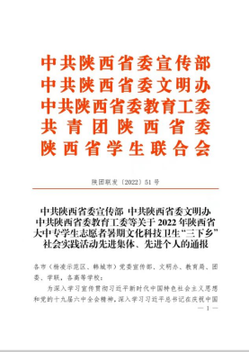 近日,由陕西省委宣传部、省委文明办、省委教育工委、团省委、省学联等单位联合组织开展的“2022年陕西省大中专学生志愿者暑期文化科技卫生‘三下乡’社会实践活动”评选表彰结果揭晓,我校荣获“2022年‘三下乡’活动省级优秀组织单位”;我校“酷暑激扬青春志,心援助力精卫行”赴渭南市精神卫生中心实践团被评为“省级优秀团队”;指导教师刘原被评为“省级先进个人”。