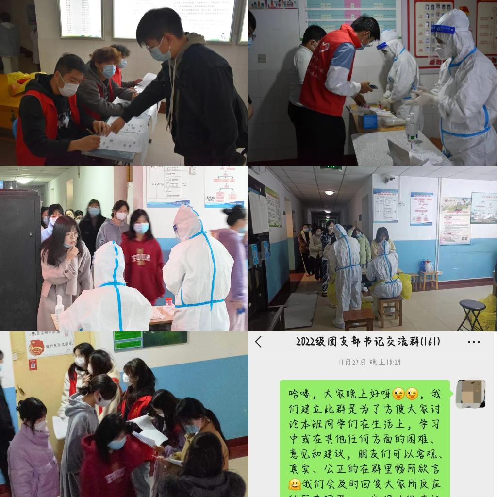疫情当前,我校学生骨干挺身而出,在楼宇中做抗疫志愿者,在核酸检测时协助医护人员做好信息统计、扫码、测温、提醒1米线等工作,在就餐时间协助公寓管理人员做好楼内秩序维护、错峰就餐等工作。校学生会积极建立各年级团支部书记交流群、青年之声交流群等学生交流平台,了解学生需求及困难,及时反馈给学校相关部门,竭诚为学生办实事解难事,以实际行动赢得广大青年学生的信任和尊重。