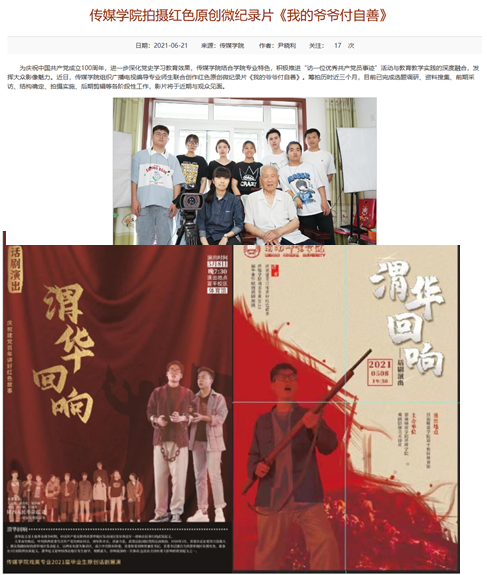 学院重视培养学生的实践创新能力,积极开展作品教学,构建 “红色育人+党史育人+实践育人+体验育人”的新模式,立德树人。重点打造的品牌方向“光影传媒”,主要分为四大模块:悦读传媒、影动传媒、名师讲堂、赛教融合。