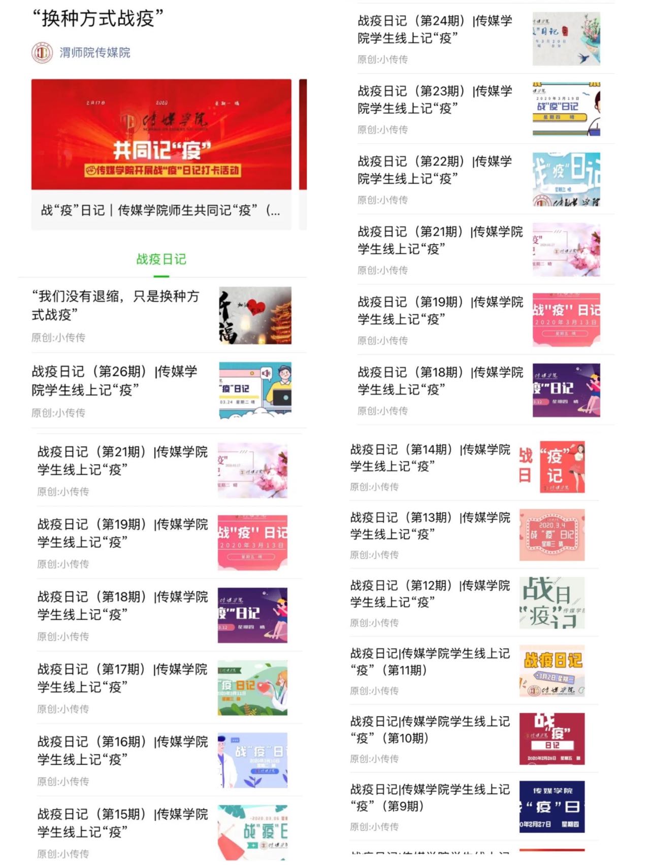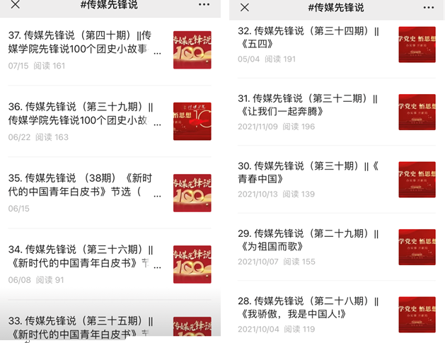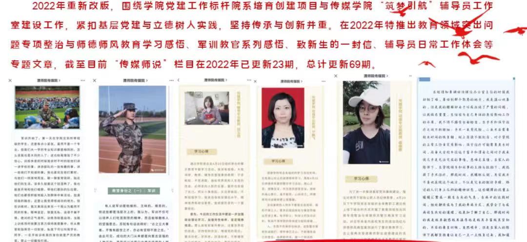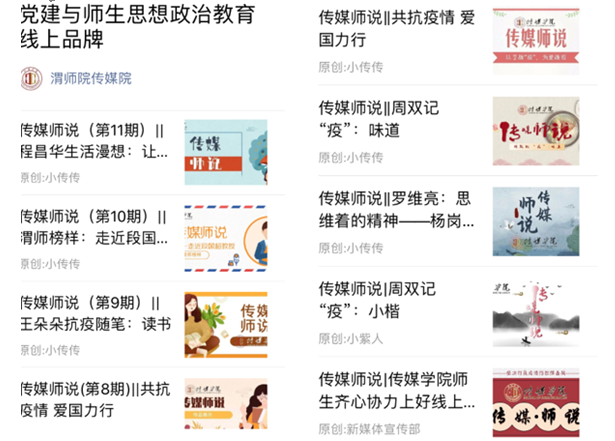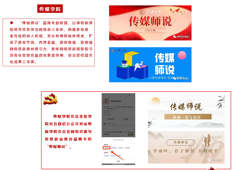 2020年初,新冠肺炎肆虐,居家抗“疫”、线上教学成了学院师生的生活和教学方式,学院利用融媒体时代特点,在官方微信公众号及时开设网络党建与思想政治教育专栏“传媒师说”,栏目紧密围绕学院党建工作,紧扣基层党建与立德树人实践,坚持文化传承与创新并重,以学院教师和优秀校友的典型事迹作为网络育人主体,创建多角度、全方位的育人环境,在增强网络思政教育吸引力、发挥网络思政凝聚力和引领青年思想方面发挥了重要作用。“传媒师说”从学习读书、考研就业、日常生活等各个方面阐发教师的思考,在平凡的生活和学习中培养青年学生的思想品德和专业技能,进一步引导青年学生树立正确的价值观,让立德树人融入教学的各个环节。学院申报的《网络党建与思想政治教育品牌专栏“传媒师说”创设》荣获学校2020年校园文化建设优秀成果二等奖。截止目前,“传媒师说”栏目已更新69期,深受师生欢迎。