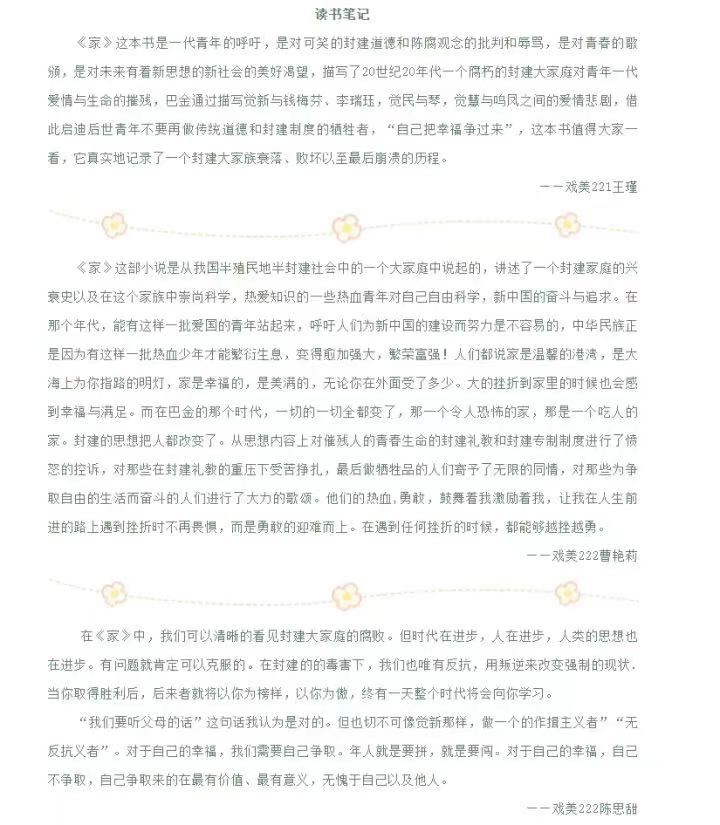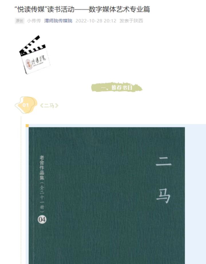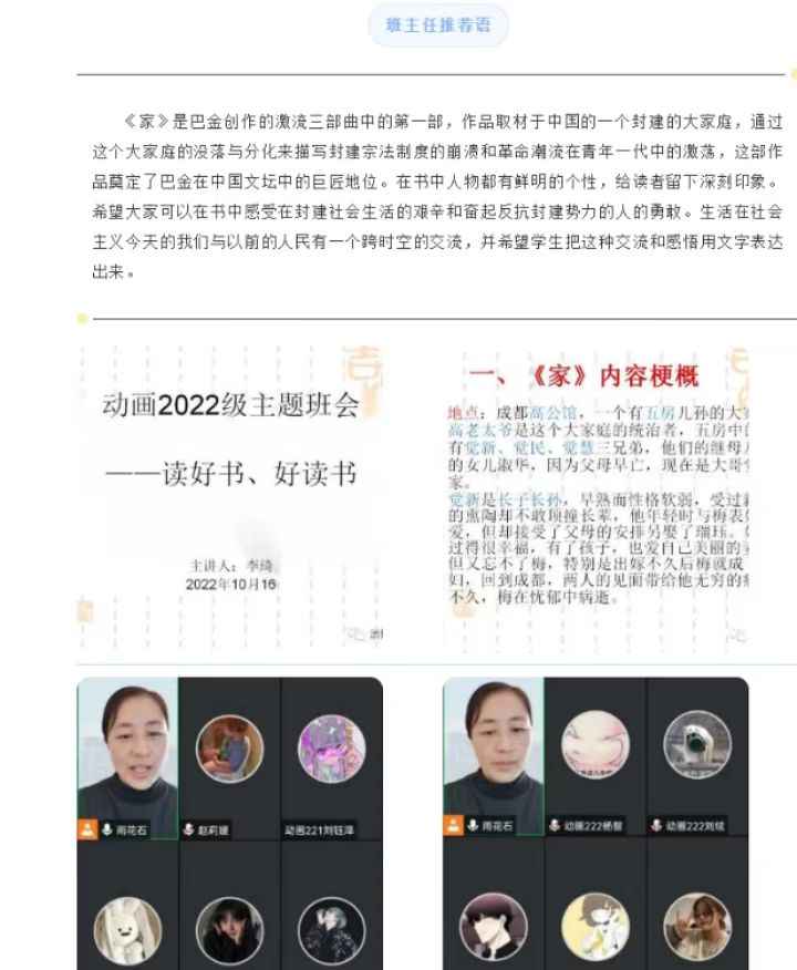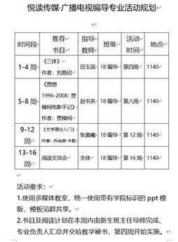 高质量的专业人才培养离不开专业素养的提升和开阔的视野,阅读是十分重要的一环。学院根据专业不同,给学生列出提升专业素养的阅读书目和文化素养阅读书目,其中提升文化素养的通识类书目有《古诗源》《美的历程》《黄河边的中国》《北大文学讲堂》等40余本;根据专业差异性,有针对性地向学生推荐专业阅读书目,每个专业均向学生推荐阅读书目50余本以上;此外,学院还推出106部中外经典的影视作品让学生鉴赏,举办影视作品鉴赏、读书心得展等。从大一开始,学院学生就由新生班主任导师引领进行大量阅读,通过大量的阅读学习、阅读讨论,开阔学生的视野,增强学生的专业知识和提升学生的文化素养。