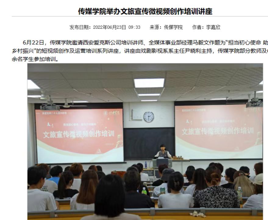 从2018年开始,学院立足国内外影视发展的实际,及时调整培养方案并推出了特色活动“微电影大赛”,紧接着又推出了“传媒学院奖”的评选活动。从2018年至今,学院每年的“微电影大赛”都紧扣时代主题、弘扬主旋律,光影交错中鼓励学生不断努力奋进,在追梦路上不断前行。动画专业师生参与“秦兵马俑数字化保护”项目;师生创作的建筑漫游片《白水仓颉庙漫游》和数字化展示作品《白水县仓颉庙虚拟展示系统》被白水县委宣传部采用,彰显了动画专业在新的三维数字化技术应用水平和服务地方优秀传统文化“两创”方面的能力和优势。戏剧影视美术设计专业师生排演的校园红色舞台剧《渭华回响》,融党史学习教育与思想启迪于一体,剧情感人,发人深思,富有教育意义。学院师生创作的纪录片《我的爷爷付自善》《一窑知千年》等作品被各大媒体竞相转载,社会反响良好。