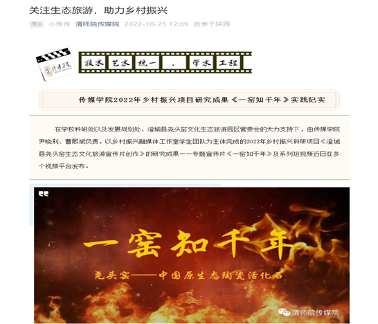 立足作品、赛教融合。学院从2018年成立伊始,就非常重视作品教学和学生参赛,目前已经形成了广泛动员、教师全程指导、学生积极参与的赛教融合模式。学院所有作品教学、作品展演都会通过渭师院•传媒院的微信公众号同步推送,极大地调动了学生的作品创作、活动参与积极性,彰显了校园文化特色品牌——“光影传媒”的建设成效。传媒学院奖、学生采风写生作品展映、师生摄影作品大赛等赛事,建党百年展、喜迎二十大等系列展映实践活动,既传承了中华优秀传统文化,又提升了学生专业实践创新能力。广播电视编导专业师生制作的纪录片《我的爷爷付自善》,被省教育厅官方微信公众号推送,被渭南市委组织部“渭南先锋”评为优秀专题片;动画、数字媒体艺术专业师生创作的党史学习教育主题创意作品,其中的红色主题系列泥塑作品和“南湖红船的穿越之旅”党史动漫APP设计作品深受好评,“南湖红船的穿越之旅”荣获第13届全国大学生广告艺术大赛一等奖、第9届全国高校数字艺术设计大赛二等奖;学生作品《云的往事》荣获第11届全国三维数字化创新设计大赛总决赛特等奖;《仓颉爷爷讲故事》作品荣获第15届全国大学生计算机设计大赛二等奖等。