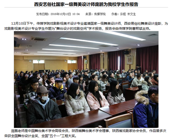 “名师讲堂”栏目创设于2018年,旨在通过学术讲座和报告,提升学生的文化专业素养以及综合能力。“名师讲堂”既有校内名师开讲,也有校外专家学者的精彩报告,为师生的文化素养、研学创作指引了方向和最新的学术动态。截止目前,先后举办了《舞台设计艺术与戏剧空间的联系和交融》《红色记忆与秦腔艺术虚拟现实展示》《秦东文化遗产三维数字化实践》《专业与未来的思考》《大学生的时代责任与担当》等各类讲座、报告30余场次,为增强学生文化自信、厚植家国情怀和专业能力提升起到了积极的作用。