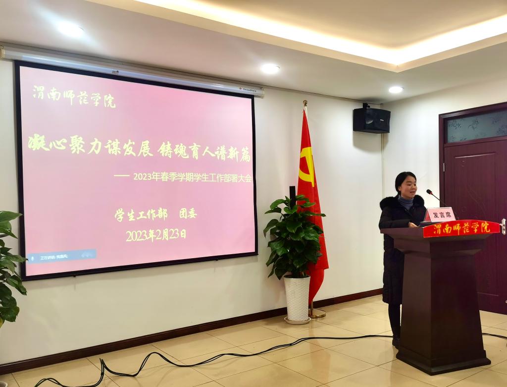 学生工作部部长田耿辉从疫情防控网格化管理、思想政治教育创新工作、辅导员工作站建设、学生工作亮点及突出成绩等方面对2022年主要学生工作进行回顾,并以《携手奋进 守正创新 数字赋能 铸魂育人》为题,结合2023年学生工作总体思路,对2023年春季学期重点学生工作进行部署。