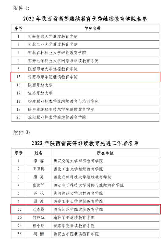近日,陕西省高等继续教育学会发布《关于公布2022年陕西省高等继续教育优秀继续教育学院、继续教育优秀校外教学站点、继续教育先进工作者评选结果的通知》(学(办)字〔2023〕02号),我校继续教育学院荣获“陕西省高等继续教育优秀继续教育学院”,刘永勤荣获“陕西省高等继续教育先进工作者”。