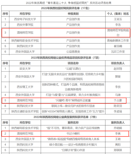 2月21日,由陕西省委教育工委开展,陕西高校网络思想政治工作中心组织实施的2022年陕西高校“青年喜迎二十大 争做校园好网民”系列活动评选结果揭晓,我校电视台获评“2022年陕西校园好网民(集体)”,于占豪负责的项目《“闪耀吧·青年”网络视听正能量》获评“2022年陕西高校网络公益优秀精品项目”,李真负责的案例《书记小喇叭》获评“2022年陕西高校网络公益典型案例”。