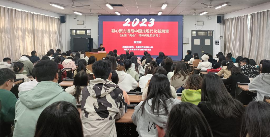 4月6日,第十四届全国政协委员、西北大学博士生导师崔亚丽教授应邀为马克思主义学院师生作了题为《凝心聚力谱写中国式现代化新篇章——全国两会精神传达及学习》的2023年全国两会精神宣讲报告,校长张守华陪同参观,学校副校长卢爱刚、马克思主义学院全体教师和部分学生到场听报告会。