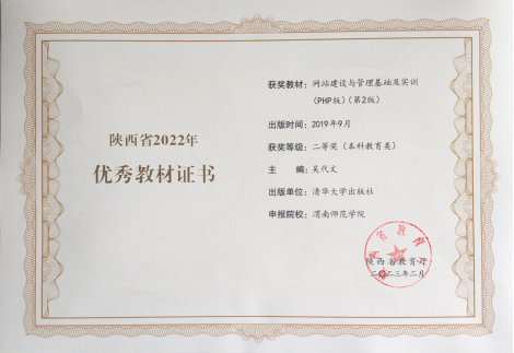 近日,陕西省教育厅公布了2022年陕西普通高等学校优秀教材获奖名单,我校教育科学学院吴代文老师主编的《网站建设与管理基础及实训(PHP版)(第2版)》教材荣获陕西省高等教育优秀教材二等奖。