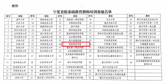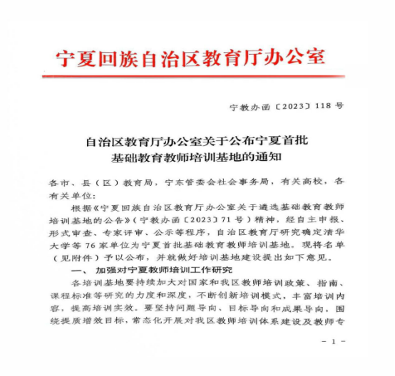近日,宁夏回族自治区教育厅办公室印发《关于公布宁夏首批基础教育教师培训基地的通知》(宁教办函〔2023〕118号),我校成功入选宁夏首批基础教育教师培训基地。