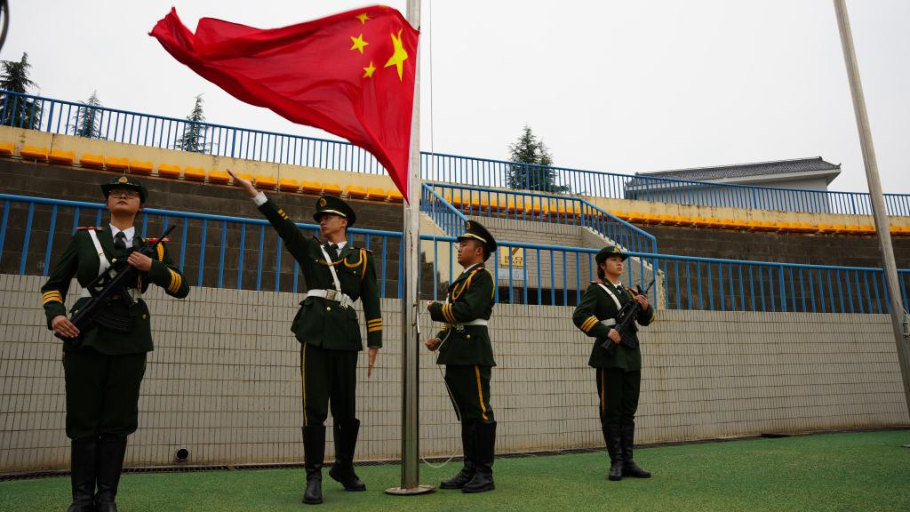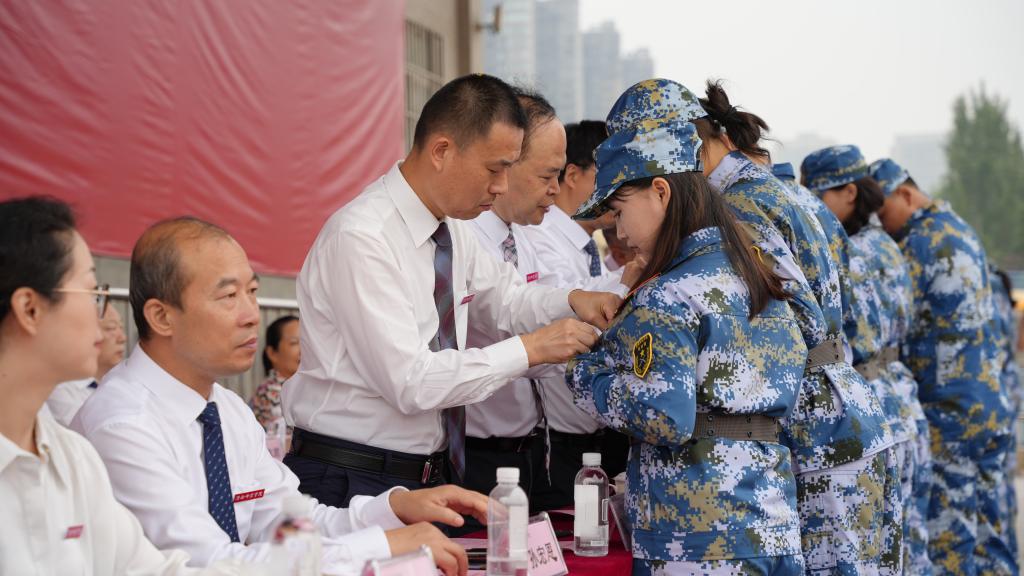 授旗仪式上,卓宇将军训团团旗授予军训团长周振赢,标志着学校2023级新生军训团的正式成立。