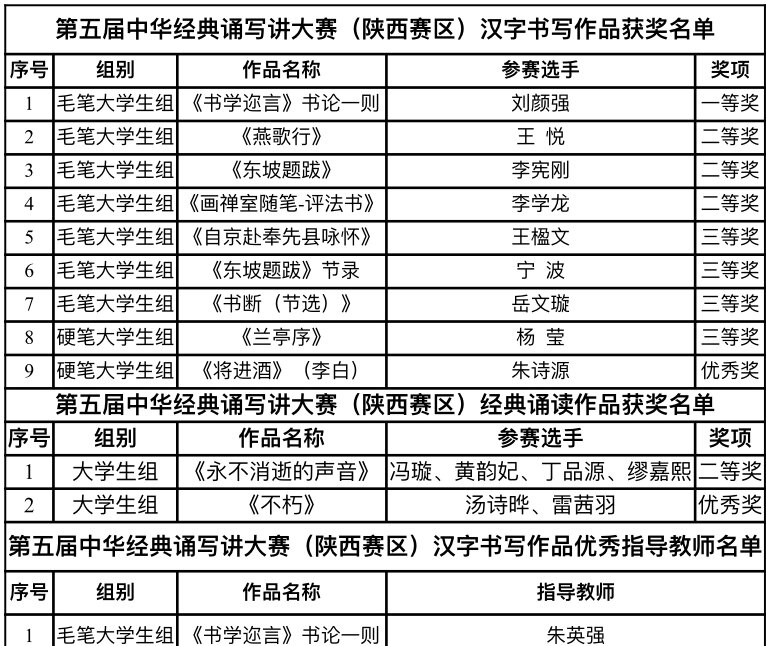 近日,陕西省教育厅公布了第五届中华经典诵写讲大赛“诵读中国”经典诵读大赛和“笔墨中国”汉字书写大赛两个赛项的省级比赛作品评选结果,我校学生参赛的作品荣获大学生组一等奖1项、二等奖4项、三等奖4项、优秀奖2项。美术学院教师朱英强获毛笔书法汉字书写大赛优秀指导教师奖。