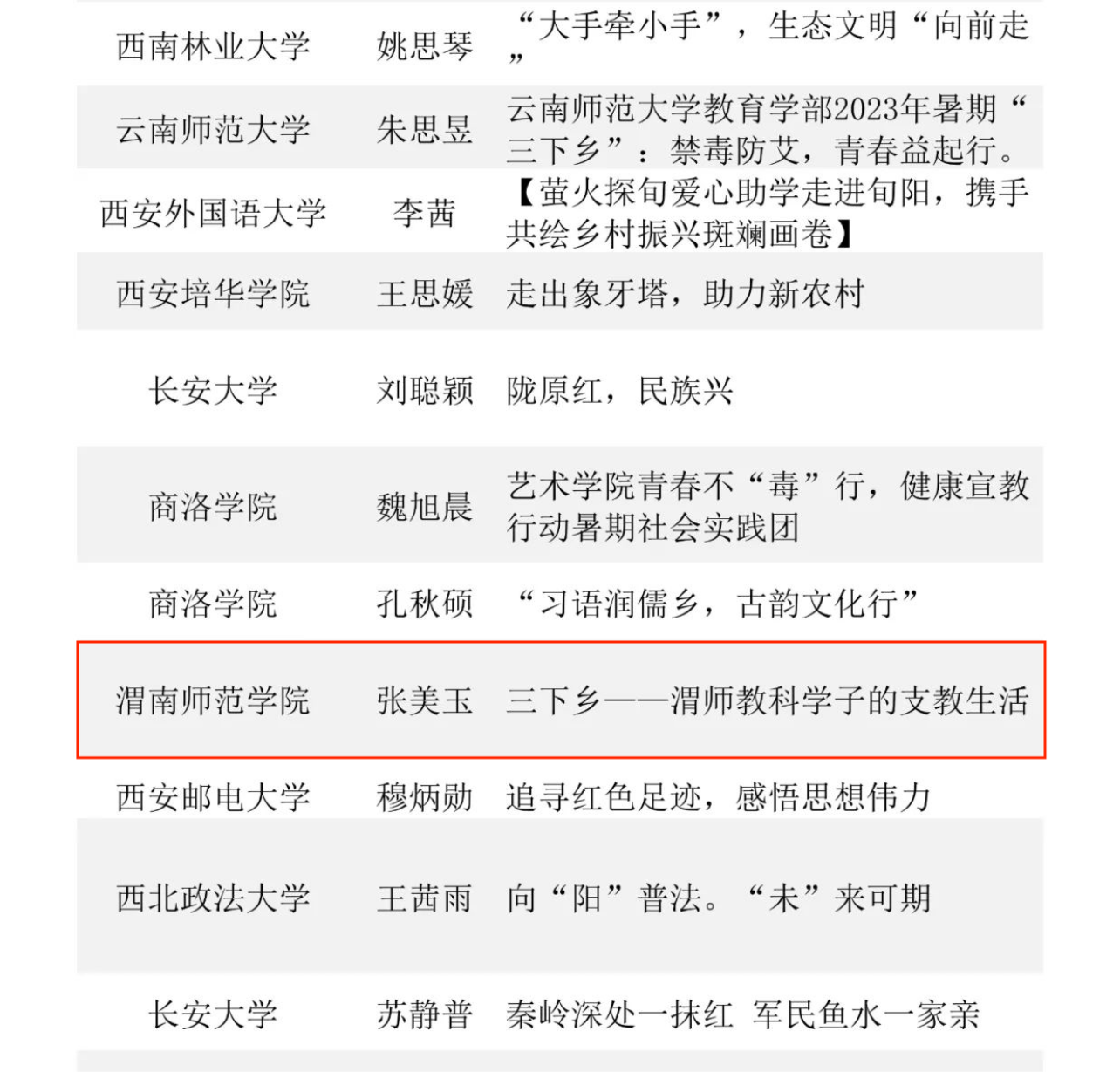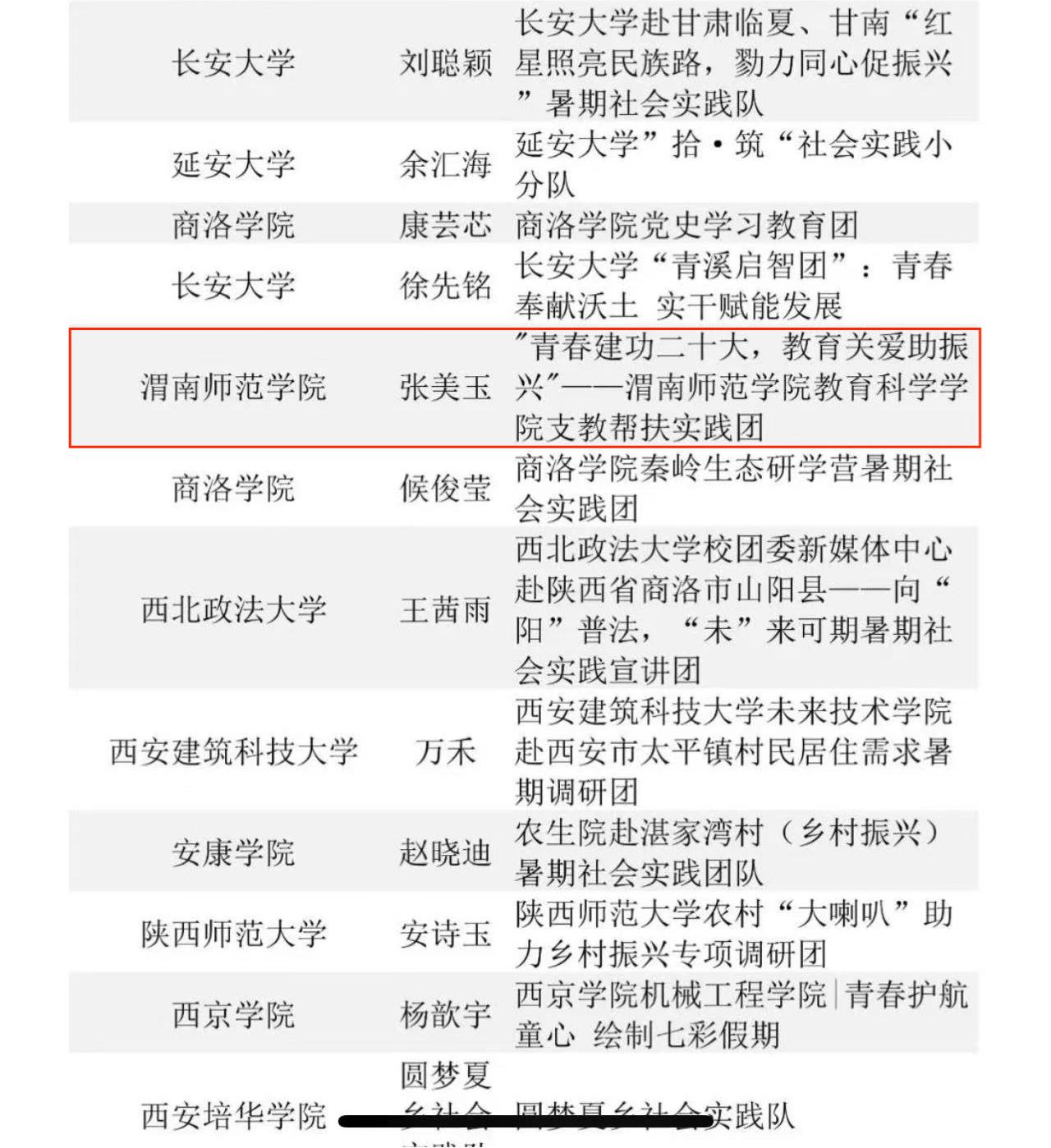 近日,在中国青年报社主办2023大学生社会实践成果“千校千项”网络展示活动中,我校社会实践校级团队“青春建功二十大,教育关爱助振兴”——欧宝娱乐官方app教育科学学院支教帮扶实践团荣获2023大学生社会实践成果“千校千项”网络展示活动优秀项目奖,该实践团视频制作者张美玉《三下乡一一渭师教科学子的支教生活》荣获优秀视频奖。