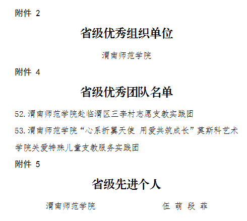 我校赴临渭区三李村志愿支教实践团、“心系折翼天使用爱共筑成长”关爱特殊儿童支教服务实践团荣获“省级优秀实践团队”;实践团队指导教师:外国语学院团总支书记伍萌、莫斯科艺术学院团总支书记段菲荣获“省级先进个人”。