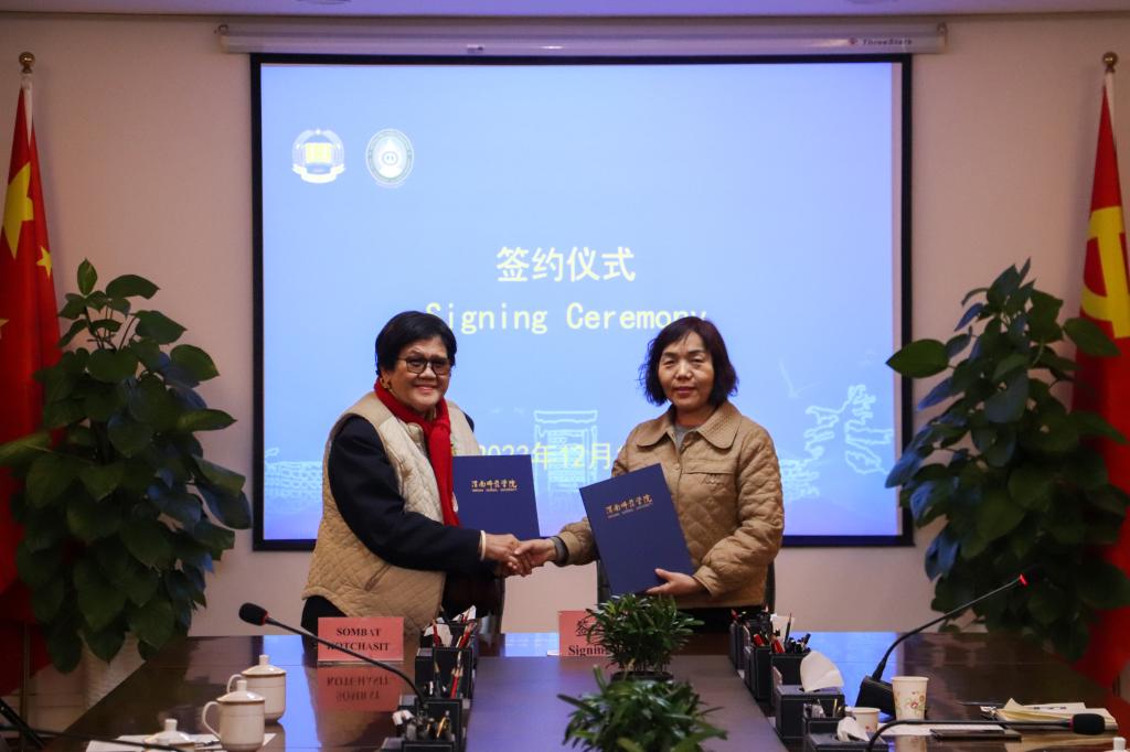 12月19日下午,泰国瓦拉亚隆功皇家大学(简称瓦大)校长SOMBAT KOTCHASIT,副校长ORASA CHAROONTHAM、PANNRAPHAT TAKOLPUCKDEE一行9人代表团来访,与我校正式建立教育合作关系。