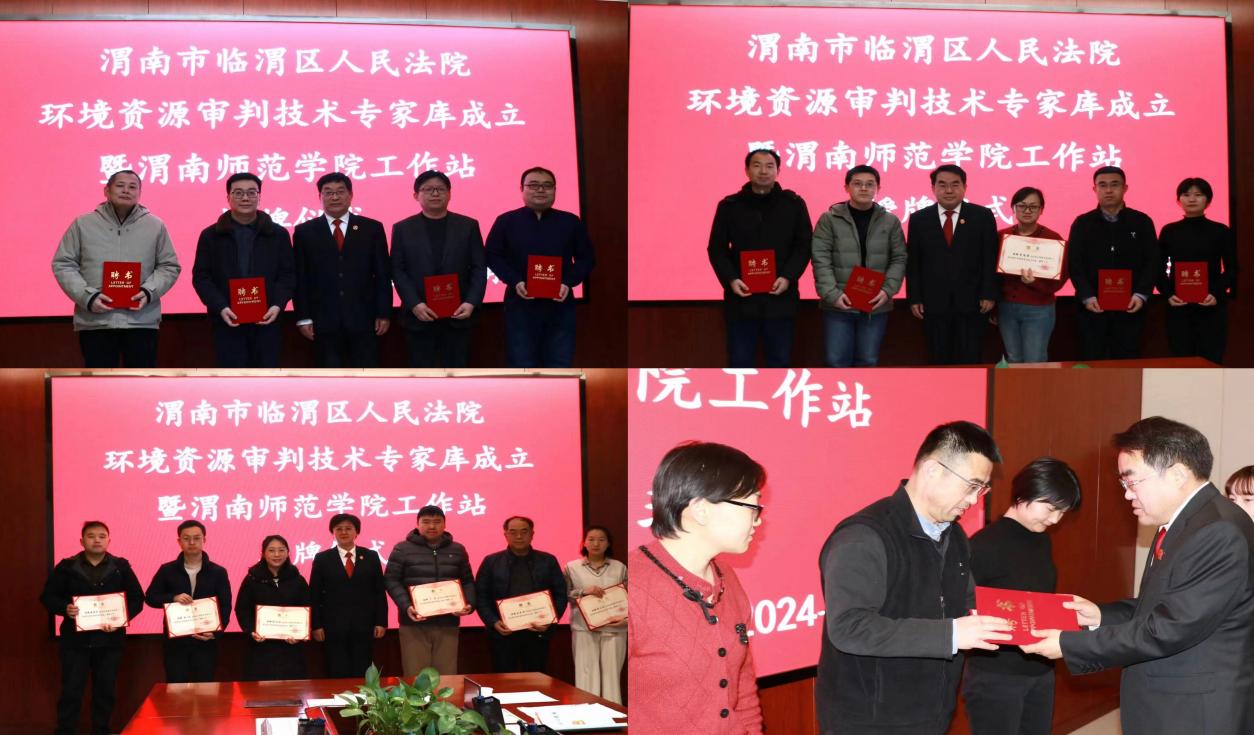 在成立仪式上,渭南市中级人民法院副院长徐红卫为21名教师颁发了环境资源审判技术专家聘书,临渭区法院院长张东亮为欧宝娱乐官方app颁发“环境资源审判技术专家库欧宝娱乐官方app工作站”牌匾。会后,临渭区人民法院组织受聘专家等参观环境资源审判法庭。(通讯员 刘楠楠 审核人 吴逸群)