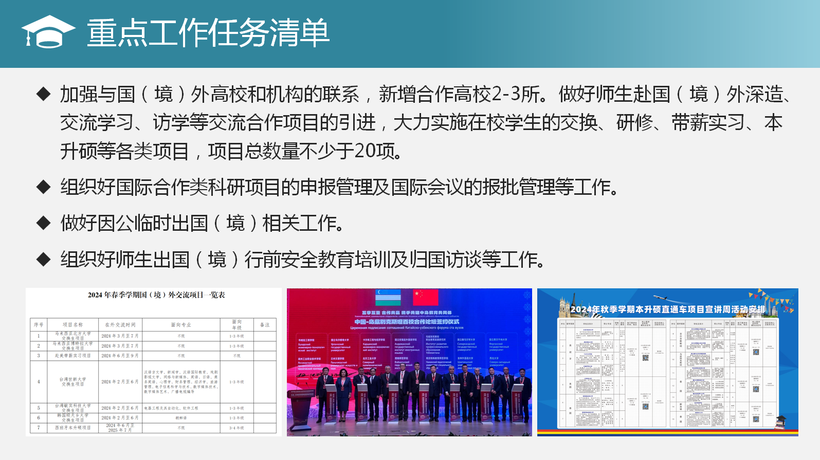 浩荡春风起,奋进脚步疾。为进一步明确工作目标、理清工作思路,营造干事创业的浓厚氛围,激发推动高质量发展的强劲动力,特推出“锚定目标笃行实干 聚力向前共谱新篇”系列报道,集中“晾晒”各二级单位2024年重点工作任务清单,“晒”出比学赶超的新方向,“晒”出实干担当的好作风,形成一项一项抓落实、稳扎稳打干实事的生动实践,以奋斗的姿态合力描绘学校事业高质量发展的崭新图景。