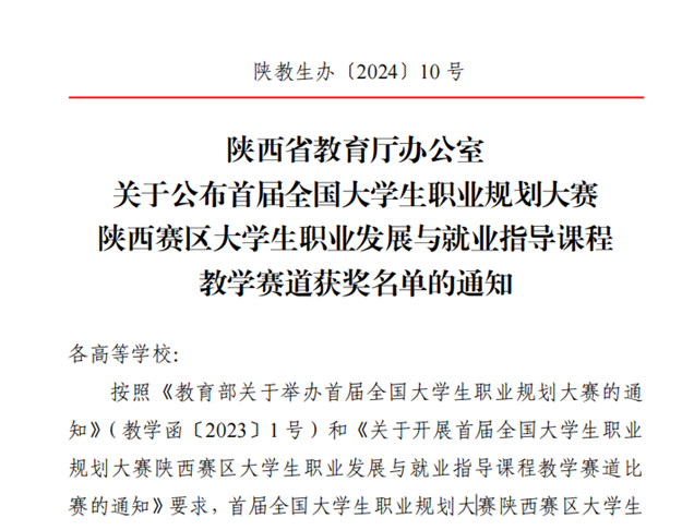 3月27日,陕西省教育厅公布了首届全国大学生职业规划大赛陕西赛区大学生职业发展与就业指导课程教学赛道获奖名单。经专家评审,高教组最终评出金奖4人、银奖7人,铜奖11人。我校经济与管理学院教师黄东梅及其课程团队成员获高教组铜奖。