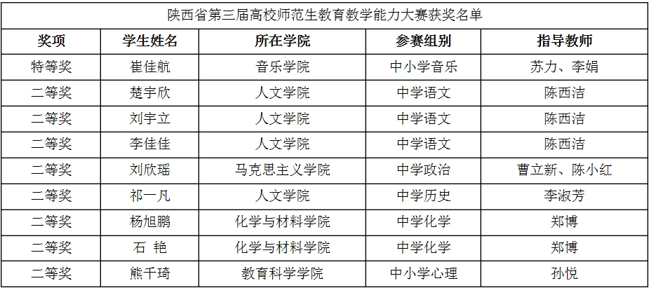 近日,陕西省第三届高校师范生教育教学能力大赛决赛成绩揭晓,我校共有10名师范生参加了语文、政治、历史、化学、心理、音乐等6个学科的省级决赛,最终获得特等奖1项、二等奖8项。音乐学院苏力、李娟荣获优秀指导教师。