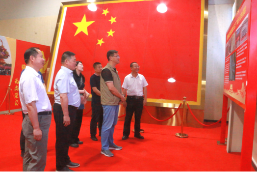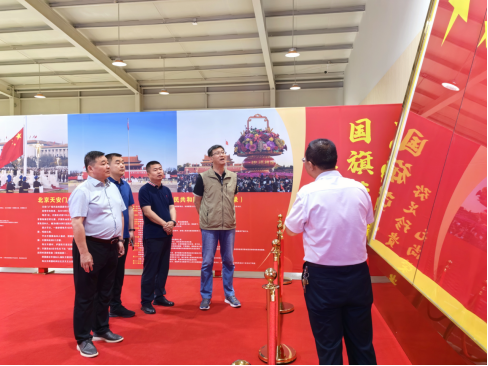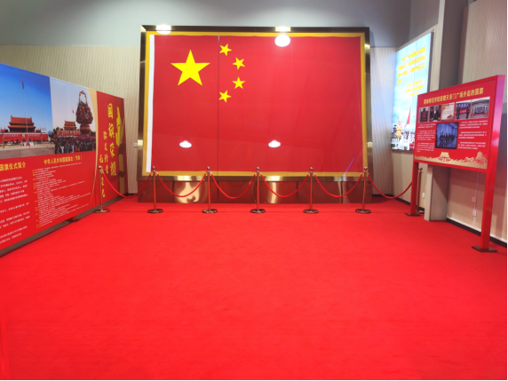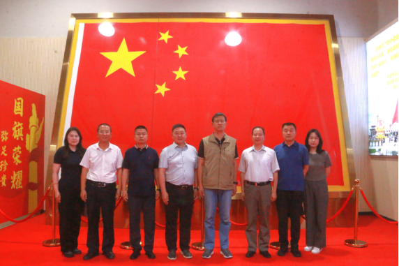 姚辉一行实地考察调研了我校“国旗展馆”,听取了校团委书记赵琦关于“国旗展馆”设计理念和展陈思路的汇报。“国旗展馆”整体庄重大气,以“国旗红”为主色调,全馆铺设红色地毯。进入展馆红色大门,迎面为全幅展示的“天安门广场国旗”。国旗置于大型展柜之中,展柜长度5.4米,高度4.3米,底部厚度1米,充分完整展示出“天安门广场国旗”的宏伟风采。国旗正对面为长7米、高2.5米的天安门城楼全景图片,彰显出“天安门广场国旗”的独有特质。