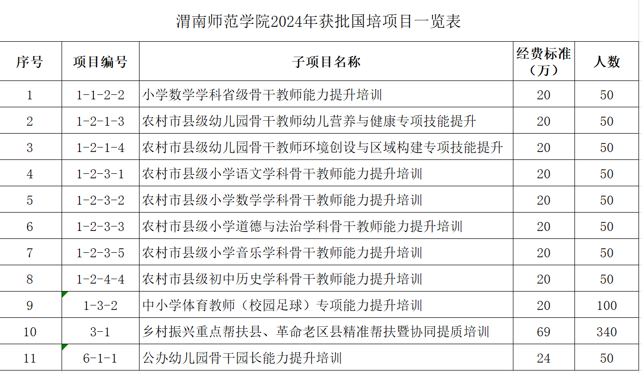 8月1日,陕西省教育厅发布了《关于拟定2024年“国培计划”——陕西省中西部骨干项目承办单位的公示》,我校获批2024 年“国培计划”—陕西省中西部骨干项目子项目共11项,培训学段学科涉及幼儿园、小学数学、小学语文、小学音乐、小学道德与法治、初中历史、初中体育等,培训总人数890人。