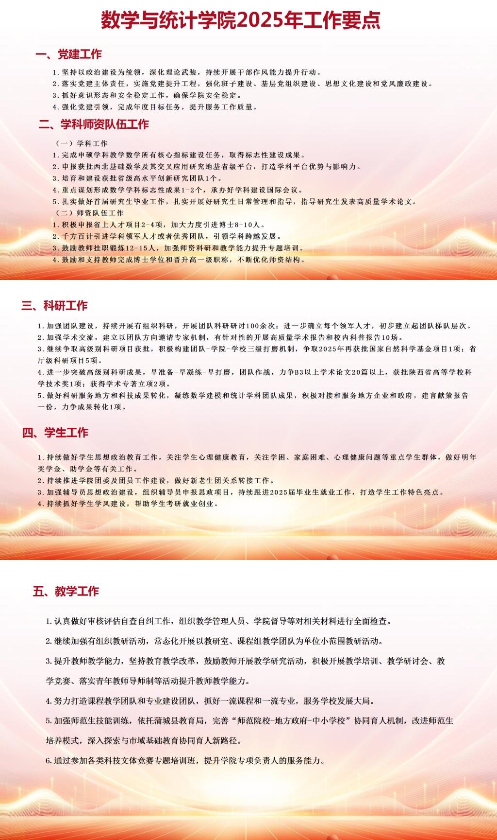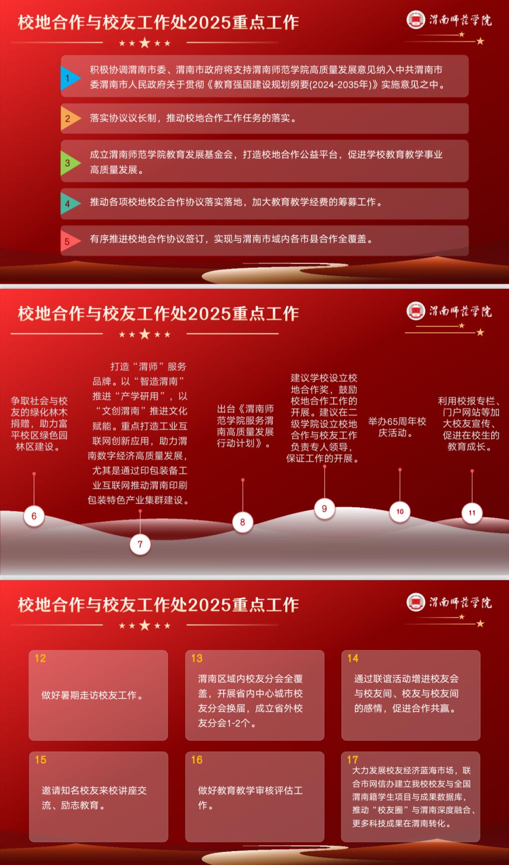【编者按】为进一步坚定攻坚方向、明确奋进目标,营造干事创业的浓厚氛围,特推出“谋发展・克难关・共奋进”系列报道,集中宣传展示全校各二级单位2025年重点工作规划,挖掘各单位在聚焦学校“九项任务、八个调研、五场硬仗”中的新思路、新举措、新目标,搭建各单位相互交流、相互学习的平台,促进经验共享、协同发展,形成全校一盘棋、共促大发展的良好局面,全面呈现学校上下一心、砥砺前行的精神风貌,激励全体师生员工积极投身学校建设,为实现学校高质量发展贡献智慧和力量,携手在教育强国建设中书写渭师崭新篇章。