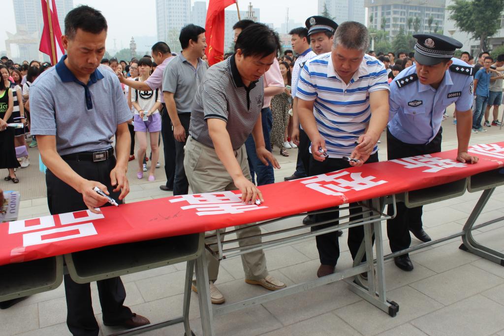 为进一步提高大学生对毒品的认知和了解,树立拒毒、防毒的自我保护意识,增强法制观念,6月12日,学校保卫处联合临渭区站南办、站南派出所、临渭区缉毒大队举办了“手拉手、抵制新型毒品 ,齐参与、共建无毒校园”千人签名活动。副院长李海龙和站南办、站南派出所、缉毒大队等领导出席了签名活动。我校1000余名师生观看了禁毒展板,听取了有关讲解,并积极参与签名活动,部分学生还现场同意担任义务禁毒志愿者。