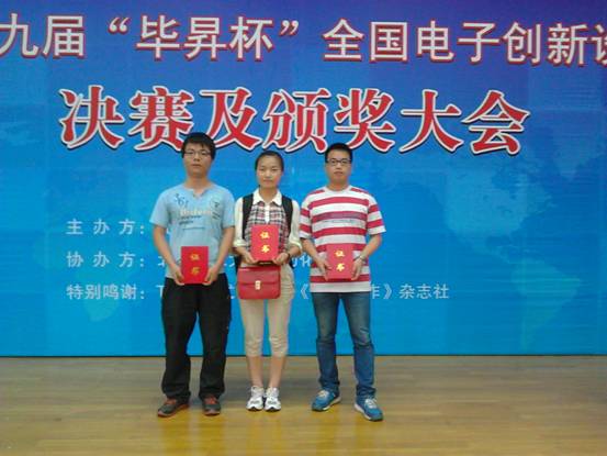 2014年6月10日,全国大学生电子创新设计竞赛决赛在北京理工大学中心教学楼一楼大礼堂隆重举行。来自全国50余所高校,346组参赛队进行了决赛。我校王洋洋、郝林钊、叶爽三位同学在2014年”毕昇杯”全国大学生电子创新设计竞赛决赛中,自主设计的 “3D显示装置”,凭借他们的实力从所有参赛队中脱颖而出,获得全国唯一的“TI”特等奖,这是我校连续五年参加该项竞赛所获得的最高奖项。