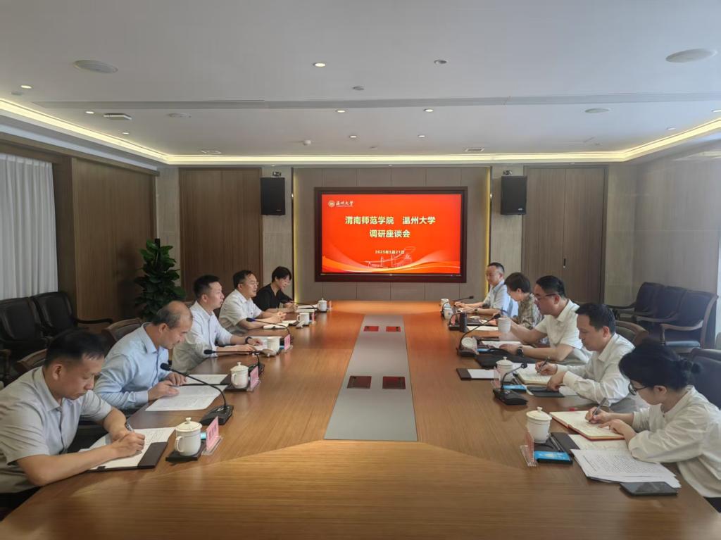 20日,李强一行走访温州大学。温州大学党委书记钱强、副校长王舜出席座谈会,该校教务处、人事处、公共事务管理处负责人参加座谈交流。李强介绍了我校基本情况和教师教育等工作。钱强对李强一行表示热烈欢迎,全面介绍了温州大学建设发展情况,希望两校在处科级干部交流挂职等方面开展合作。与会人员就师范人才培养、创新创业教育、机构设置、后勤服务保障等工作展开交流。