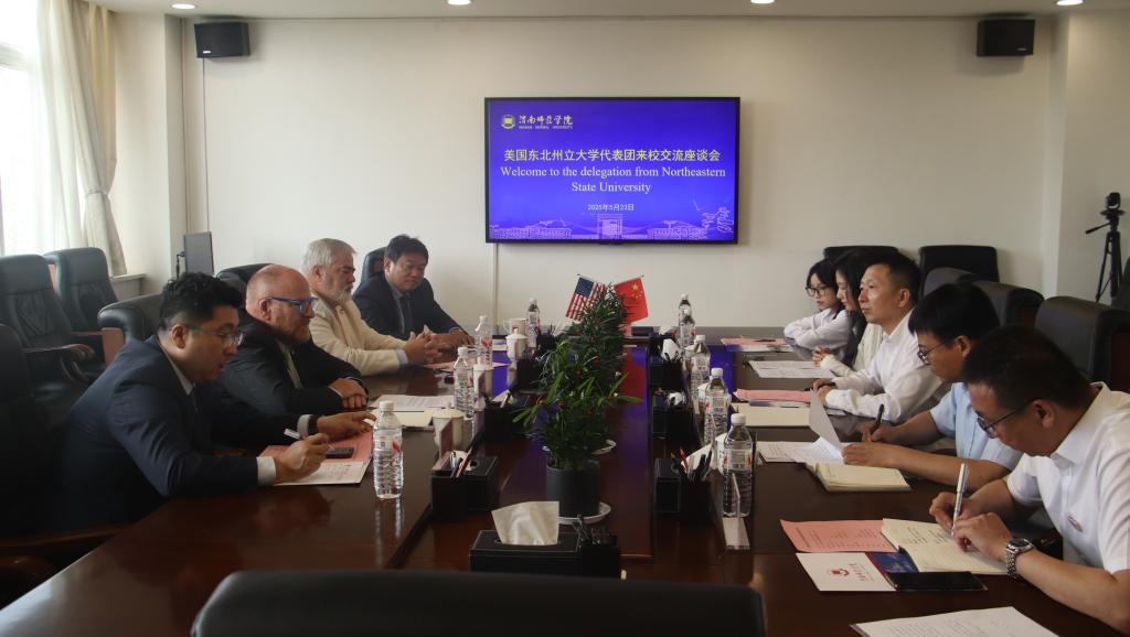 5月23日上午,美国东北州立大学校长 Rodney Hanley(罗德尼・汉利)、副校长Danny Mabery(丹尼・马伯里)、国际项目管理处处长Xuan Li(李晅)、北京办公室主任卢志刚一行4人来我校交流访问,校长李强、党委副书记常青林亲切会见来宾并座谈,座谈会由常青林主持,国际合作与交流处全体人员参加座谈会。
