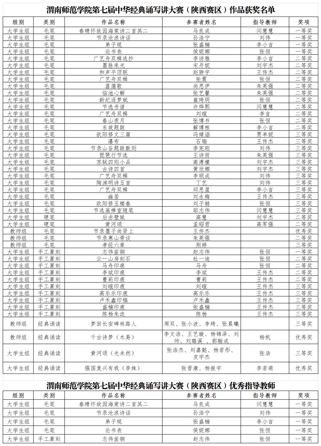 近日,第七届中华经典诵写讲大赛(陕西赛区)评选结果正式公布。我校在汉字书写、经典诵读、师生篆刻等三大赛事中收获多项荣誉,其中一等奖5项、二等奖17项、三等奖20项、优秀奖3项,李小言等5人获优秀指导教师。