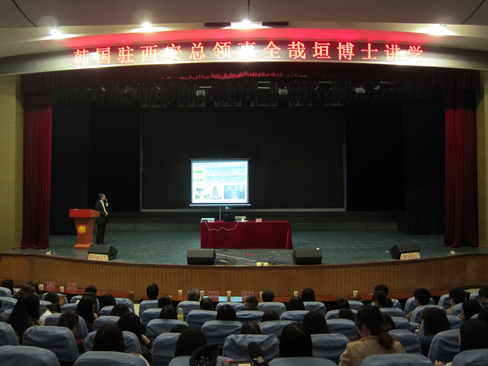 10月15日下午,韩国驻西安总领事馆总领事全哉垣博士在陶然楼音乐厅为我校师生作了题为“韩国教育制度与校园文化”的专题讲座。学校党委书记张金安、院长丁德科出席。党政办、社科处、国际合作与交流处等部门负责人,外国语学院领导班子成员、无课教师,我校韩语专业及其他专业学生参加。讲座由外国语学院副院长赵爱莉主持。
