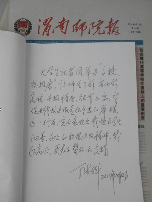 22日,丁德科院长兴致勃勃地参观了我校“第二季高校校报报展”,并欣然为活动题写留言:“大学生记者团举办高校校报展让师生了解省内外高校办报情况,很有必要,对促进我校办报是很重要的举措。这一行为,充分表现出我校大学生向善,向上的积极进取精神。我很高兴,更表示赞扬和支持。”