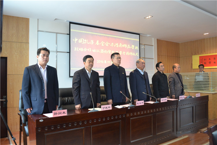 中国孔子基金会对外合作交流委员会主任杨光与我校人文与社会发展学院院长凌朝栋在合作协议上签字。中国基金会理事长王大千与党委书记张金安为孔子学堂揭牌。中国孔子基金会还聘请我校渭华学者贾巨川教授为中国孔子基金会孔子学堂主讲教授,王大千理事长为其颁发聘书。