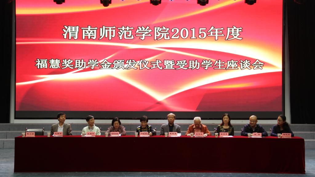 4月25日,香港福慧慈善基金会奖助学金颁发仪式暨受助学生座谈会在我校演艺厅举行。福慧慈善基金会主席严崔常敏,基金会董事宋伟文、宋何燕敏、杜佩玲,陕西省委统战部港澳海外联络处处长张丰,渭南市委台办主任许芬芳及我校党委副书记赵伏友,党委委员、组织部部长杨小渭,学工部相关负责人出席会议。各二级学院分管学生工作领导、学工办主任、主管资助工作的辅导员和300余名学生代表参加了颁奖仪式。会议由党委委员、组织部部长杨小渭主持。