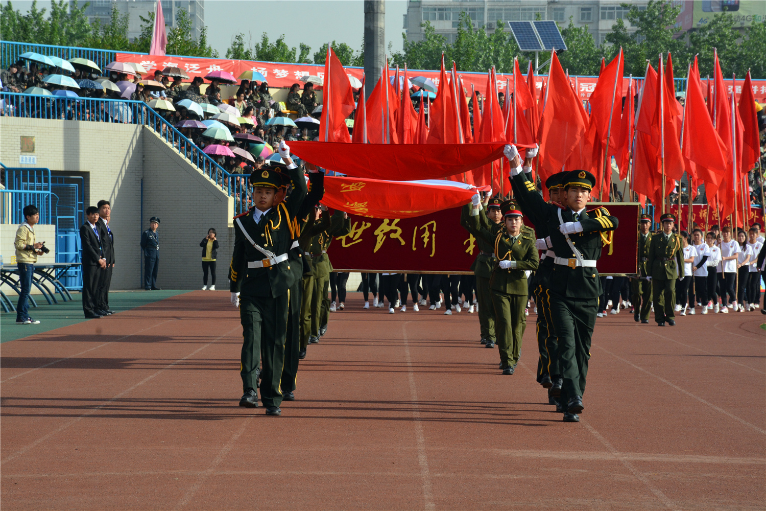 党委书记张金安宣布此次田径运动会正式开幕。在庄严的国歌、校歌声中,校国旗仪仗队依次将国旗、五环旗、校旗升起。副院长李海龙致开幕词,他对本次运动会的召开表示祝贺,向辛勤筹备运动会的运动员、裁判员表达了亲切的问候和诚挚的谢意。