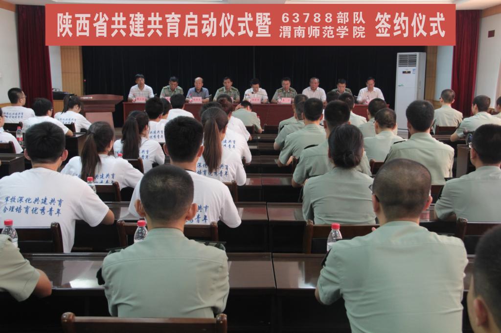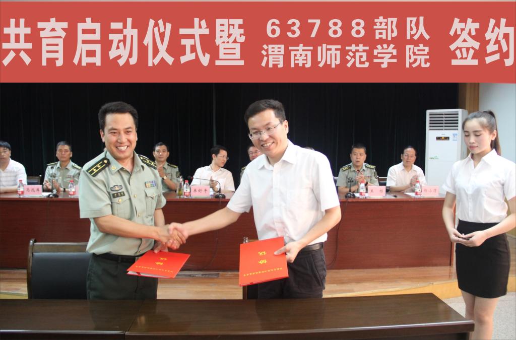 7月28日, 63788部队与我校签约仪式在渭驻地部队举行。共青团陕西省委副书记单舒平、我校党委书记张金安、党委副书记赵伏友,党委委员、组织部长杨小渭, 63762部队政委李宁大校,英模单位63788部队政委马远库上校、站长王栋上校,我校党政办、人武部、团委等部门负责人及学生代表、官兵代表参加签约式。