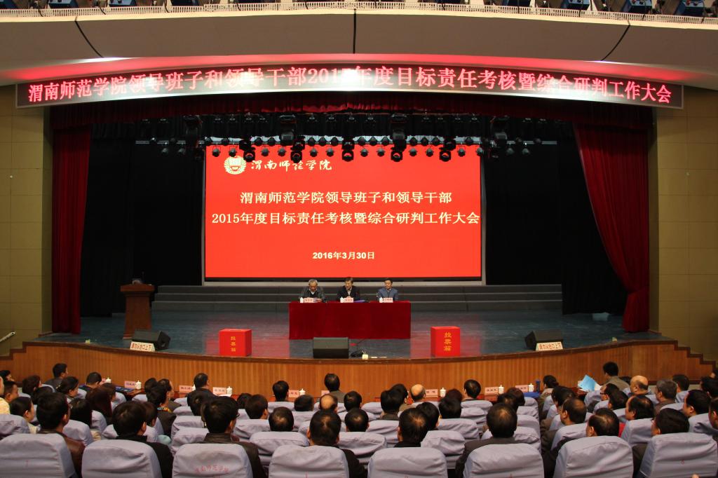 按照省委组织部、省委高教工委的安排,3月30日,学校在陶然楼演艺厅召开校级领导班子和领导干部2015年度目标责任考核暨综合研判工作大会。陕西省属高校领导班子和领导干部目标责任考核暨综合研判第四工作组组长、省委高教工委委员、统战部部长李智军等一行6人来我校,对学校领导班子和领导干部进行年度目标责任考核和综合研判。大会由校党委书记张金安主持。