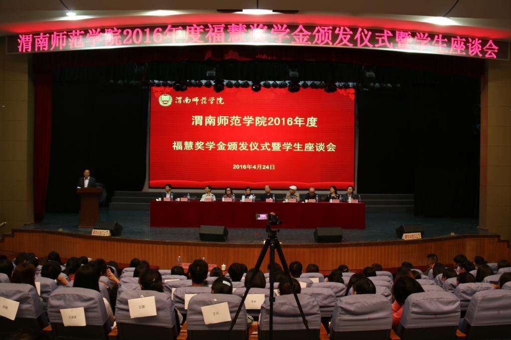 4月24日,香港福慧慈善基金会奖学金颁发仪式暨学生座谈会在我校演艺厅举行。福慧慈善基金会主席严崔常敏,基金会董事宋伟文、宋何燕敏、杜佩玲,陕西省委统战部三处处长张丰,三处副处级调研员张树忠,渭南市台办主任许芬芳,渭南市委统战部张会娟,我校党委副书记赵伏友,党委委员、组织部部长杨小渭,学工部部长王俊安,副部长田耿辉出席会议。各二级学院分管学生工作领导、学工办主任、主管资助工作的辅导员和300余名学生代表参加了颁奖仪式。仪式由王俊安主持。