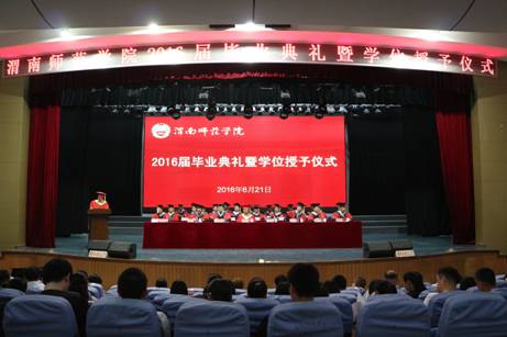 6月21日上午,我校2016届毕业典礼暨学位授予大会在陶然楼演艺厅隆重举行。学校领导、学校学位评定委员会委员、各二级学院副处以上干部、教学秘书、毕业班辅导员、校级优秀毕业生、优秀学生干部、授学位学生代表、大学生创新创业“校长奖”获奖者代表、“中国梦•爱国情•成才志”中华经典诵读获奖者代表共计400余人参加了本次毕业典礼暨学位授予大会,大会由党委副书记赵伏友研究员主持。