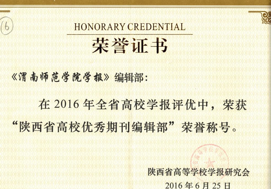 2016年6月30日至7月1日,陕西省高等学校学报研究会2016年学术年会在延安举行。会议公布了陕西高校学报研究会“四优评比”结果,《欧宝娱乐官方app学报》首次进入“陕西省高校名刊”序列,并取得了陕西高校学报优秀编辑部、优秀主编、优秀编辑、优秀编辑学论著共10项荣誉。本次评比在参评的百余家高校学术期刊中评选出“陕西省高校名刊”共18家,其中高校社科学报9家,是陕西高校学报队伍的第一梯队。《欧宝娱乐官方app学报》是“陕西省高校名刊”方阵中唯一一家地方院校主办的高校学术期刊。