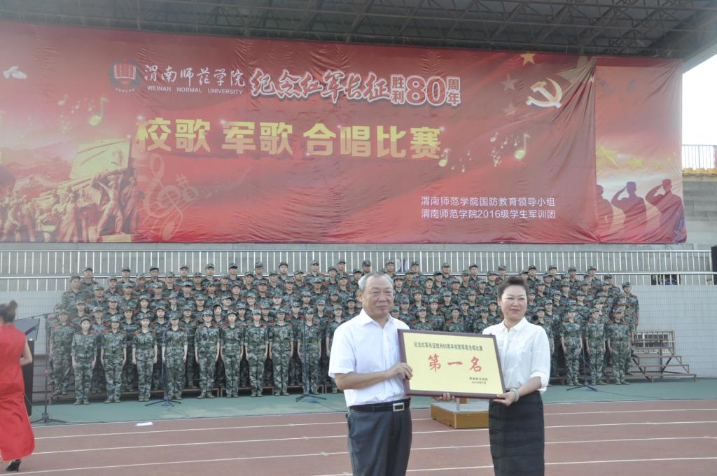 9月22日下午,我校在田径运动场举行“纪念红军长征胜利80周年校歌军歌”合唱比赛活动。各二级学院组成了9个参赛队和1个表演队。参加此次活动的领导有校党委书记张金安,校党委委员杨小渭,校长助理韩小卫,校学术委员会主任王菊霞和国防教育领队小组成员等。